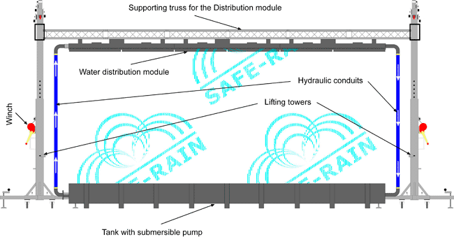 یک TRUSS مدولار که توسط برج های بالابر پشتیبانی می شود، قادر است توزیع کننده های آب را نگه دارد.